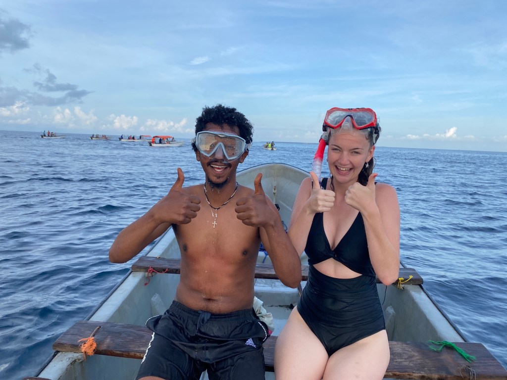 Swimming with Dolphins. Isn’t this the dream of many children everywhere? Well, in Zanzibar you can actually do this! And not in a captive, tamed, environment, but with wild dolphins out in the water at the south of the island. Locals will tell you that these dolphins are 100% wild, and that the fishmen know where to find them each morning because the first boat out always tracks them down. They’ll also tell you that the dolphins don’t mind people in the water with them because they swim so much faster than humans that often the dolphins are playful and will act as if it’s a game to see if you can find them. I’m not sure how much of these claims are true, all I know is that the dolphins are not directly harmed in any way and there’s seems to be no evidence that these are unethical tours online. We had Bara Bara book out Kizimkazi dolphin tour for us from Paje, but you can also book these tours from your hotel in Stonetown. Since this location is the southern most part of the island, it’s recommended to travel from one of these cities for it. Be prepared to wake up early on the morning of your tour. Most tours, pick you up from your hotel or accommodation at 5am which is why neither we nor our accommodation knew what would have happened if we were to have driven down ourself the morning of and showed up at the bay and searched for our own tour guide for a cheaper price. You probably could do this and likely it would be cheaper, but the fact is, it just wasn’t that expensive to have someone pick us up in Paje as part of the tour and this saved either of us from needing to drive when we were still sleepy on the opposite side of the road. You do need to get there by 6am as there were already a couple boats out at this time when we arrived and the dolphins were the most “social” from this time up until about 8am.