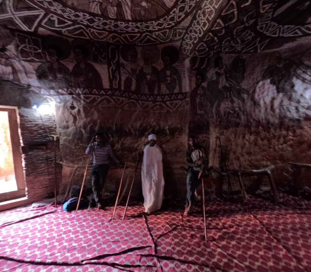 Finally we made it inside the Church and enjoyed a rest on the rugged carpets and learning more about the Church’s history . The Church was created in the 6th century to honor one of the nine saints, Abuna Yemata. The paintings inside the church are centered around the nine Saints and Twelve Apostales.