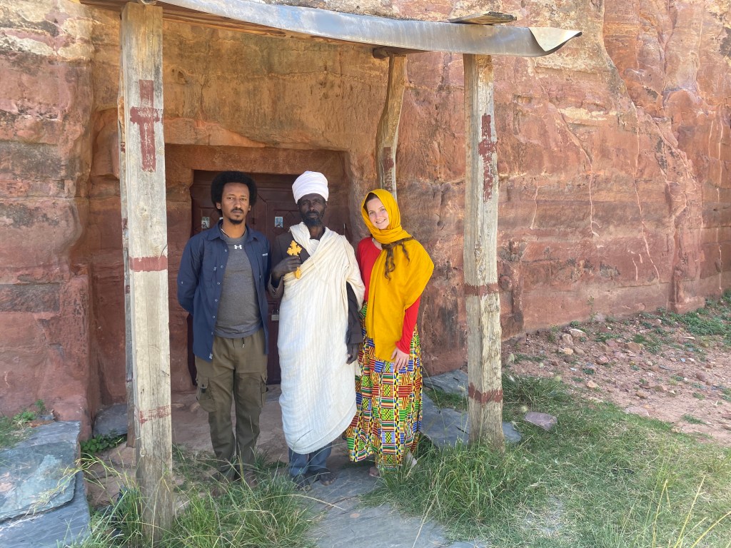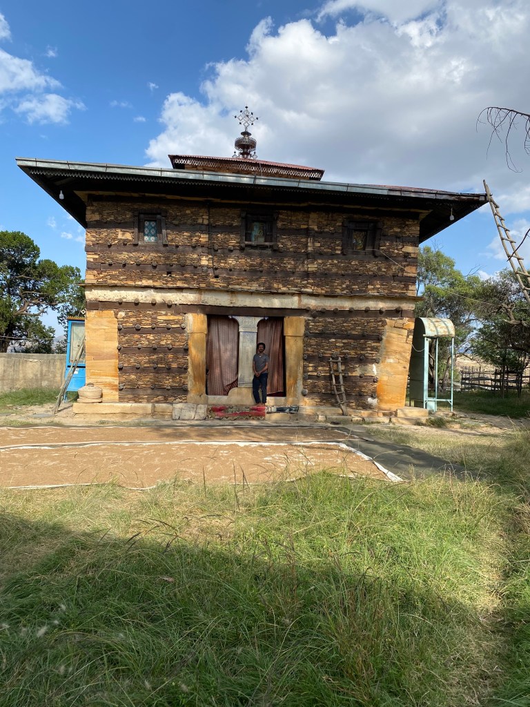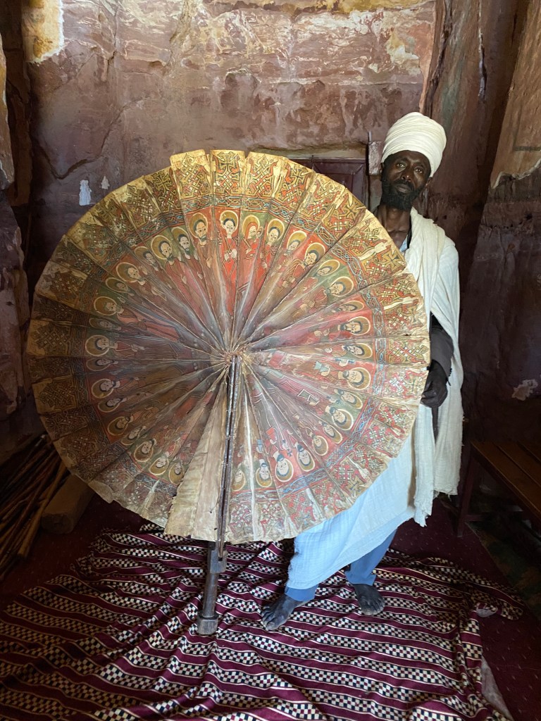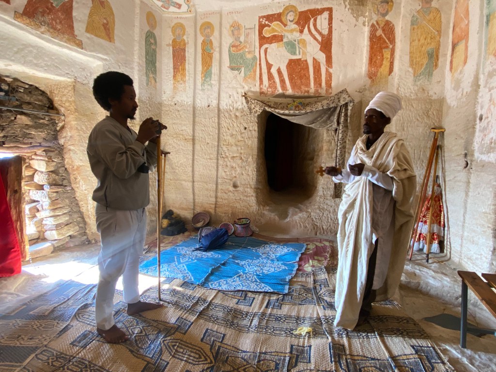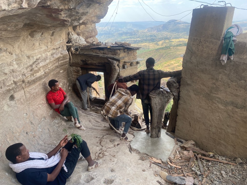 We began our second day with a “short” one hour hike up to Church Abune Abraham Debre Tsion, a Church carved out of a sandstone cliff. It was founded by the monk Abuna Abraham and likely completed during the 13th Century. The climb’s terrain was not bad, but what was, was the morning sunlight and heat. Even though these Churches are at a much lower altitude than Addis, I found myself asking our tour guide what the altitude was because of my exhaustion just halfway up the mountain. Once at the top, you are met by incredible views. Before completing the final walk across the top of the mountain to the Church, our guide showed us what he referred to as a “small cave” that was dug as the start of a Church until Abuna Abraham decided it was not the right positioning for his Church. Something special about this Church is how Abuna Abraham used to communicate. There is a carved window at the Church that points directly to a different Monastery on a separate mountain. Through this window Abuna Abraham used to communicate with other Church Leaders. The Priest also showed us an ancient fan that depicts Christian history.Another unique aspect of this Church was the rooftop. Originally, the Church was completely framed in stone, but in more recent years locals had waterproofed the top using water resistant metal and cement on top to ensure that rain would not leak through to the inside.