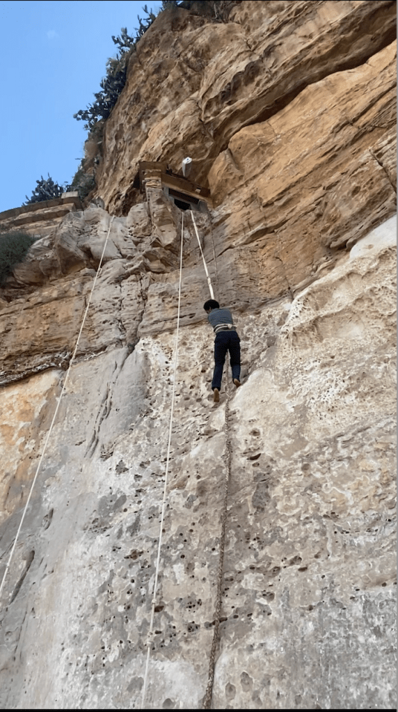 It is not a long hike to the top of the mountain, maybe around an hour up, but it is a straight up climb. So straight up in fact that when you get halfway up, you are met by a number of scouts who’s purpose is to help you safely up and down the mountain. There is a section where they ask you if you’d like a harness to which my immediate response was “yes!” I was the only one in the group to use the harness . . . and have no regrets. It was already scary enough! Once at the top you feel some relief until you realize that the hardest part, physically getting to the Church itself is yet to come. To get to the Church, you need to walk on a small rock ledge, carefully placing your hands and feet in appropriate slots along the rock cliff. Guides help you and make it look effortless on all sides of you, while if you’re like me, you’re shaking. According to the scouts and the Priest, no one has ever fallen.